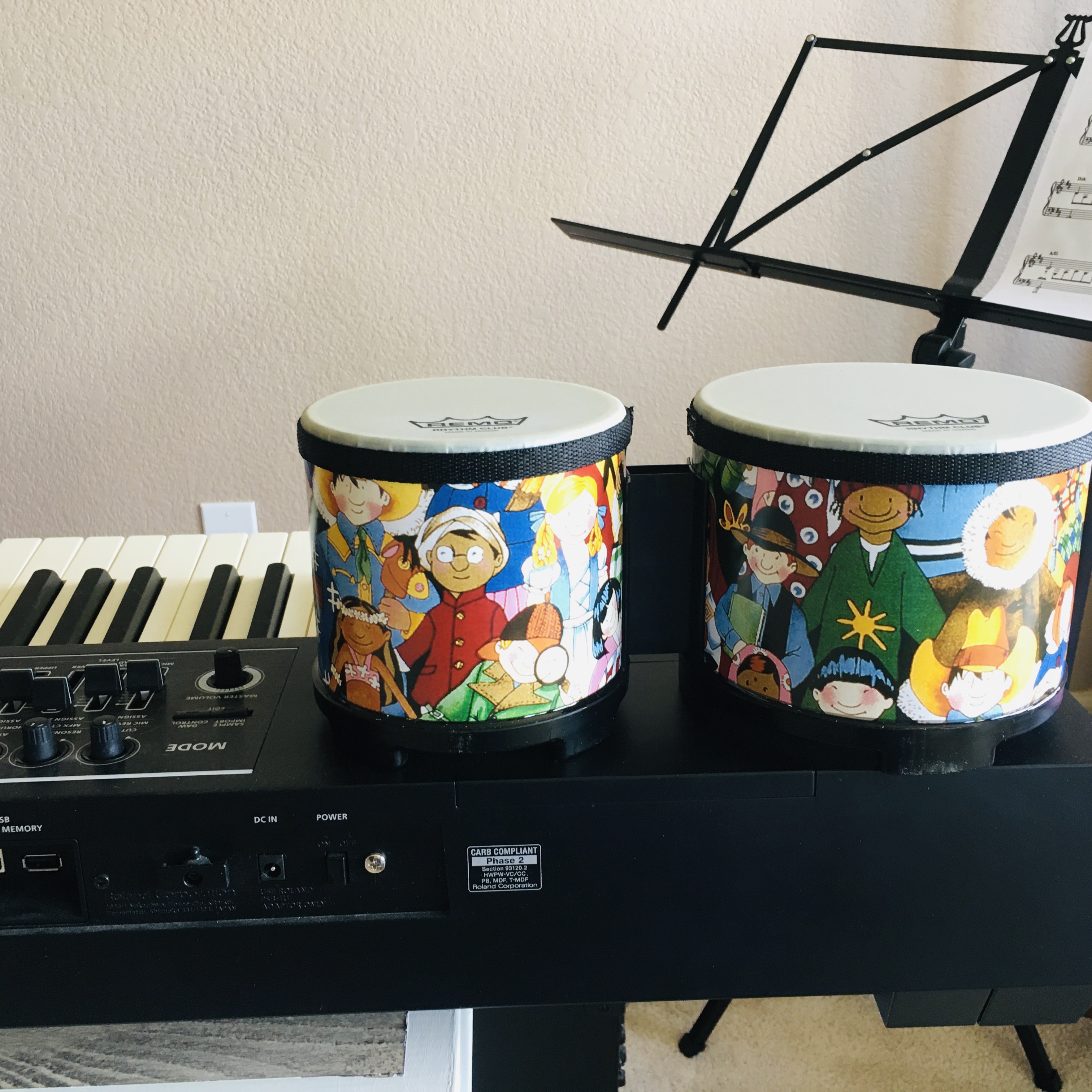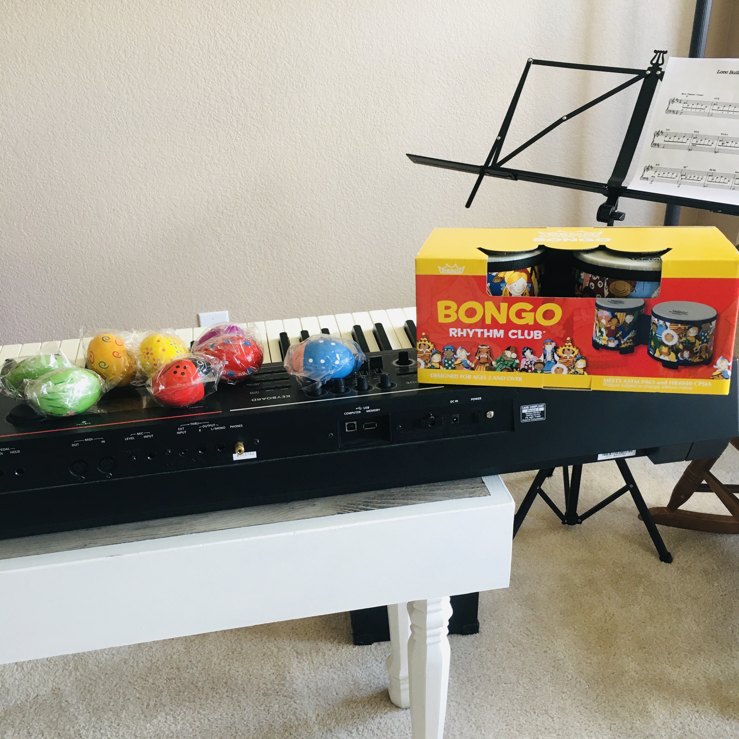 There are many ways for students to enjoy music learning in our piano lessons. One fun way is to work on rhythm! Sometimes I start the lesson with clapping rhythm (teacher-student echo and vice versa), and recently I decided to buy some simple music percussion instruments to add more fun to it! Young kids love banging on the bongos and shaking the musical eggs (maracus)!